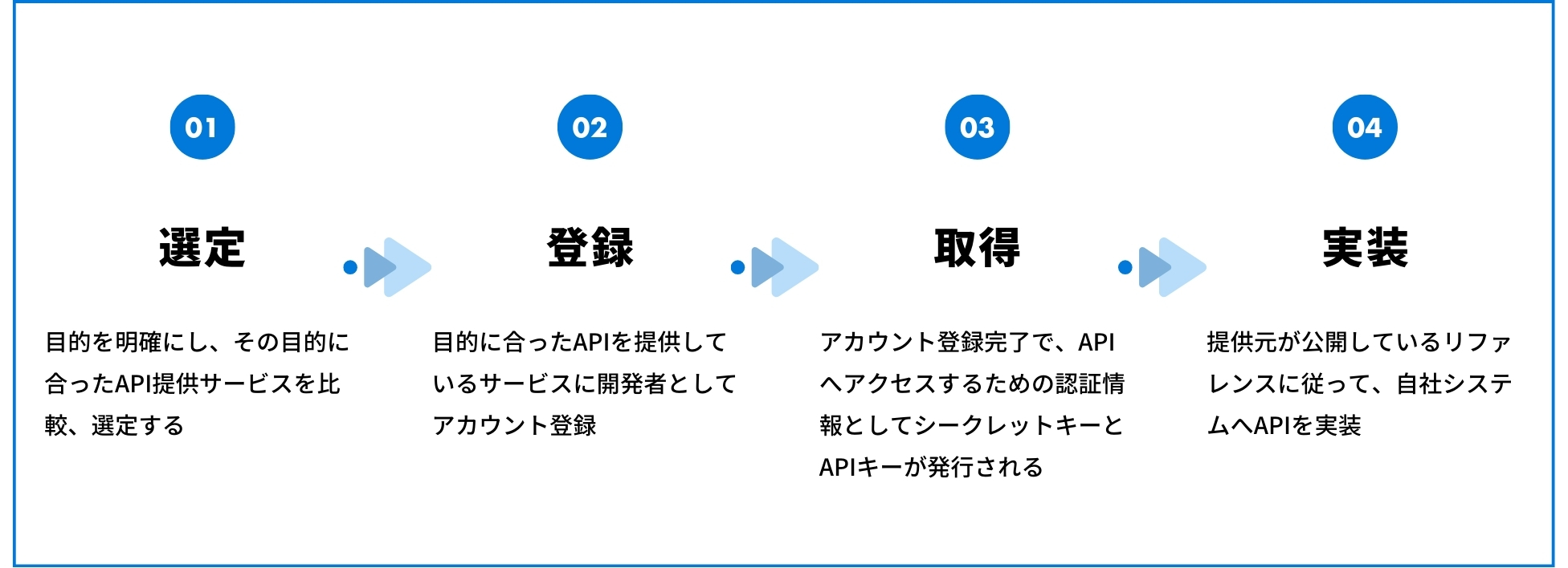 API連携を導入する際は、単にシステムを接続するだけでは十分ではありません。どの業務を改善したいのか、どのデータをどう扱うのかといった目的の整理から、API選定、アカウント登録、認証情報の取得、実装、テストまで、一連のプロセスを丁寧に進めることが求められます。ここでは、API連携を実現するための代表的な流れを4つのステップに分けて解説します。