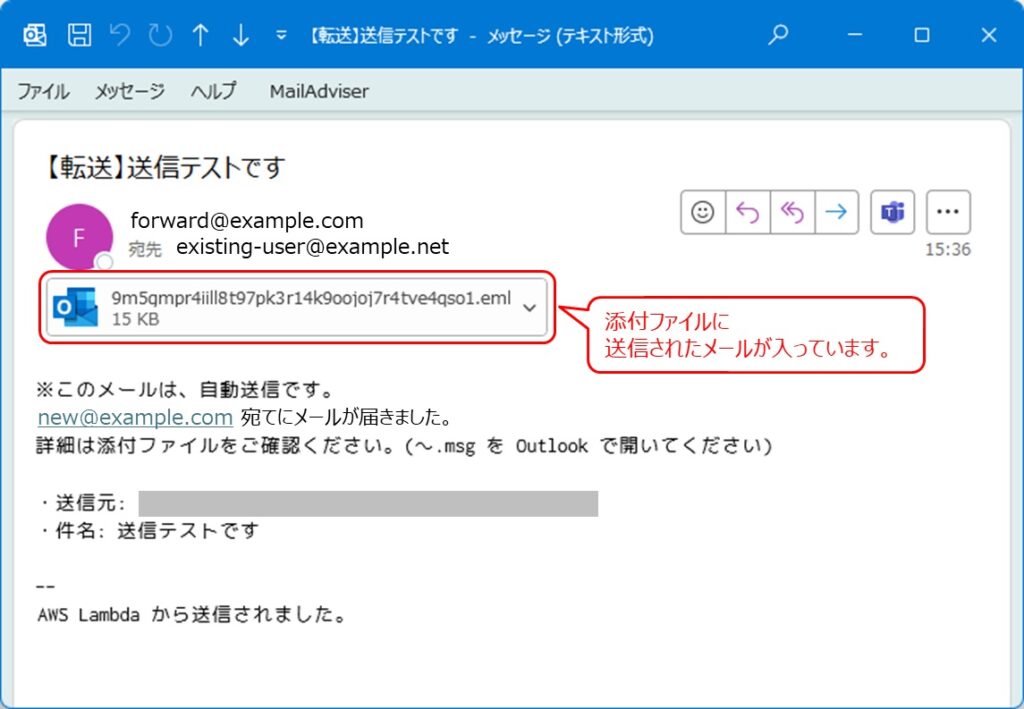 | ForwardToMailAddress | 転送先のメールアドレスを指定します。 | existing-user@example.net |
