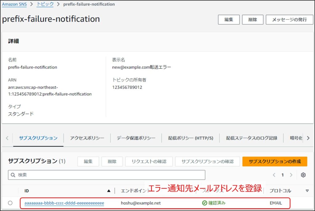 | FailureSnsTopic | 転送失敗などのエラー通知用のSNSトピック |