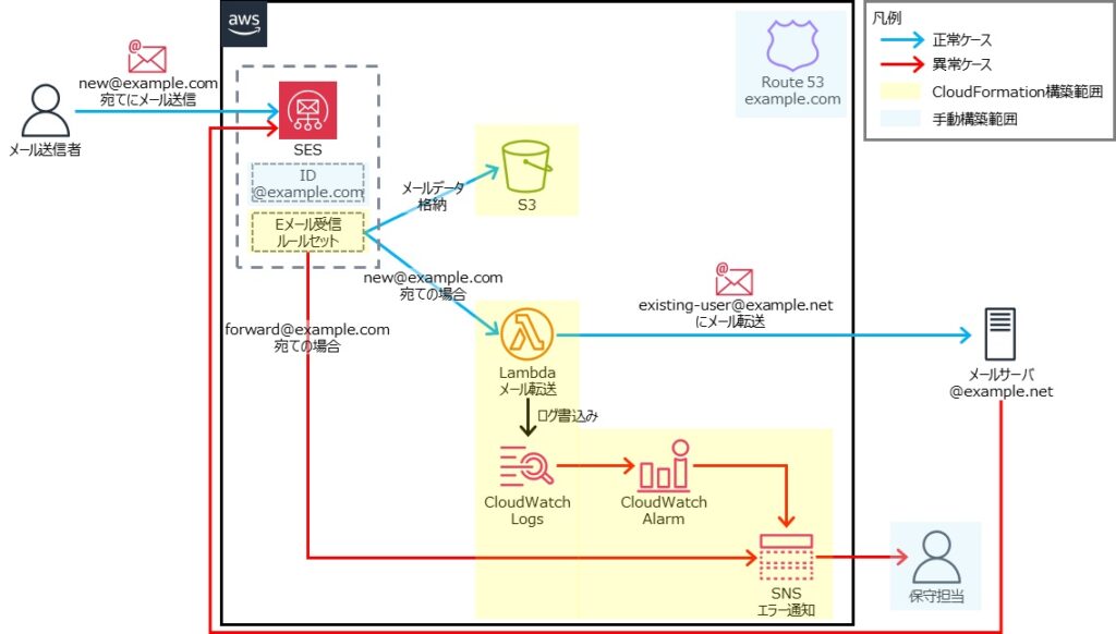 図中のメールアドレスの役割は、下表のとおりです。new@example.com 宛てにメールが届くと、existing-user@example.net にメールが転送されます。