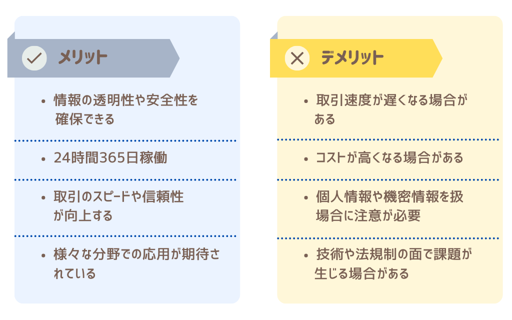 ここまで、ブロックチェーンはとても信頼性の高いシステムだと説明してきましたが、実は、いくつかデメリットが存在します。