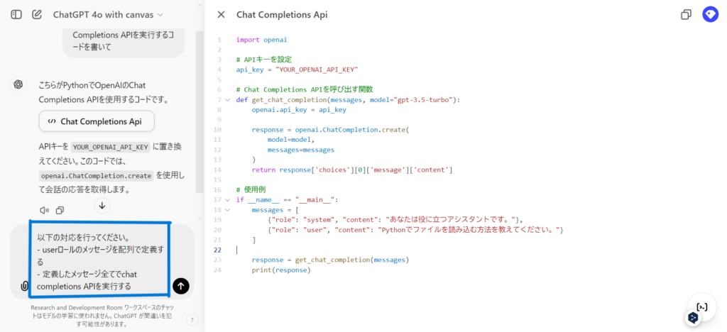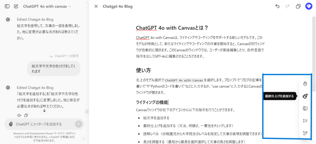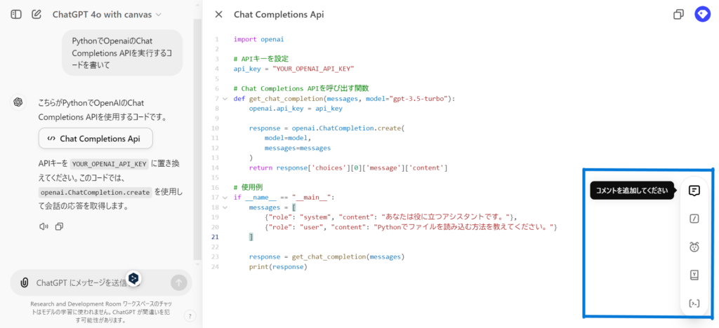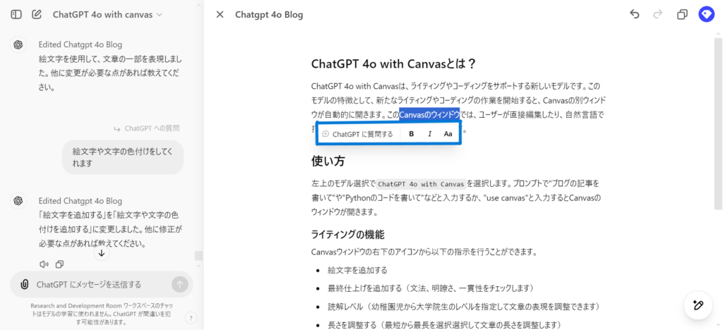 このCanvasのウィンドウでは、ユーザーが直接編集したり、自然言語で指示を出してGPT-4oに編集させることもできます。これにより、ユーザーはAIとのやり取りを通じて効率的にライティングやコーディングを進めることができ、作業のスピードとクオリティを向上させることが可能です。