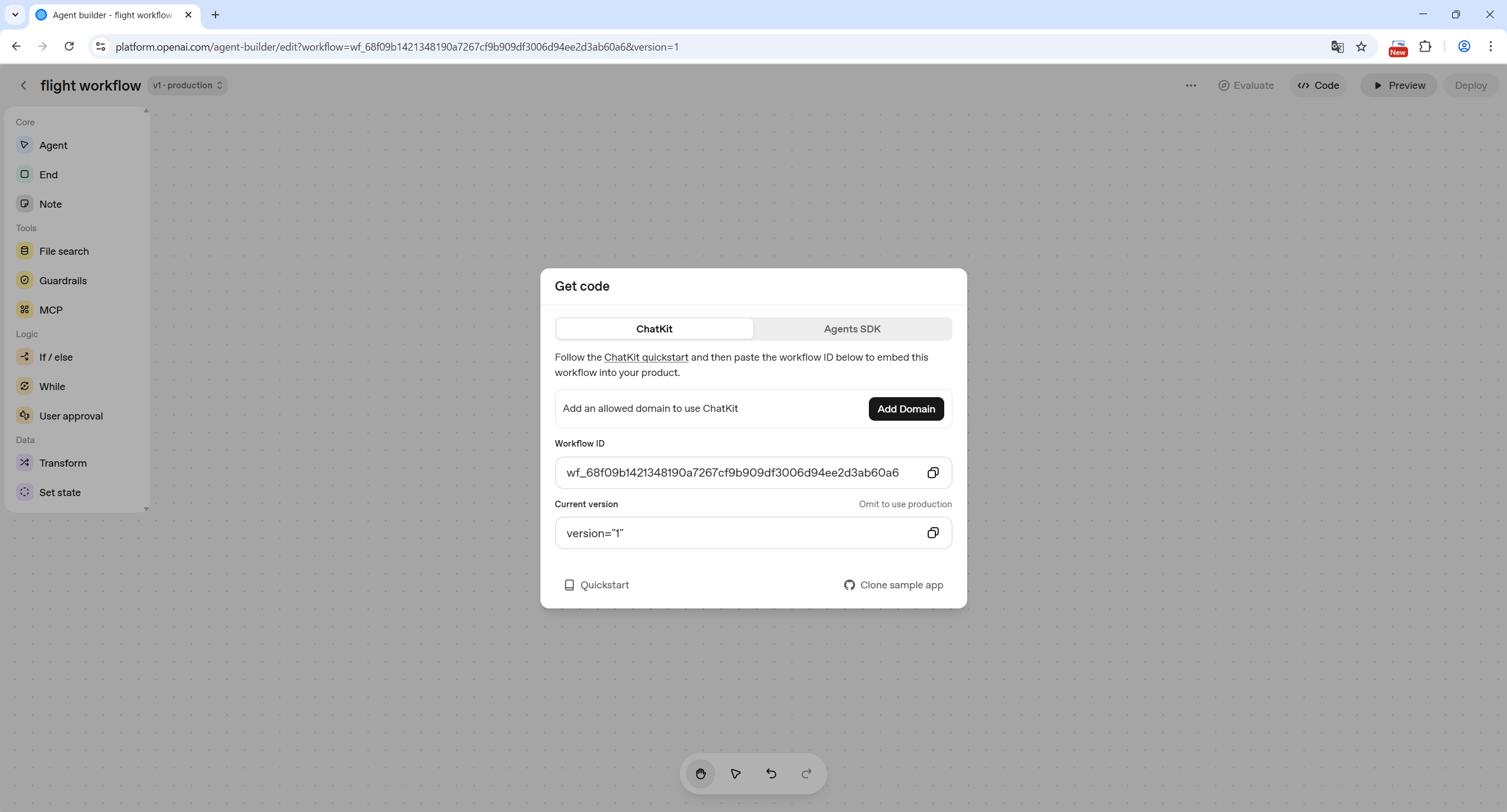 Agent Builderで簡単にエージェントを作成できたとしても、Agent Builderのプレビューでしか動かせなかったら意味がありません。その問題を解決する為に提供されているのがChatKitです。ChatKitを使えばWorkflow IDを指定するだけでエージェントを動かすことができます。