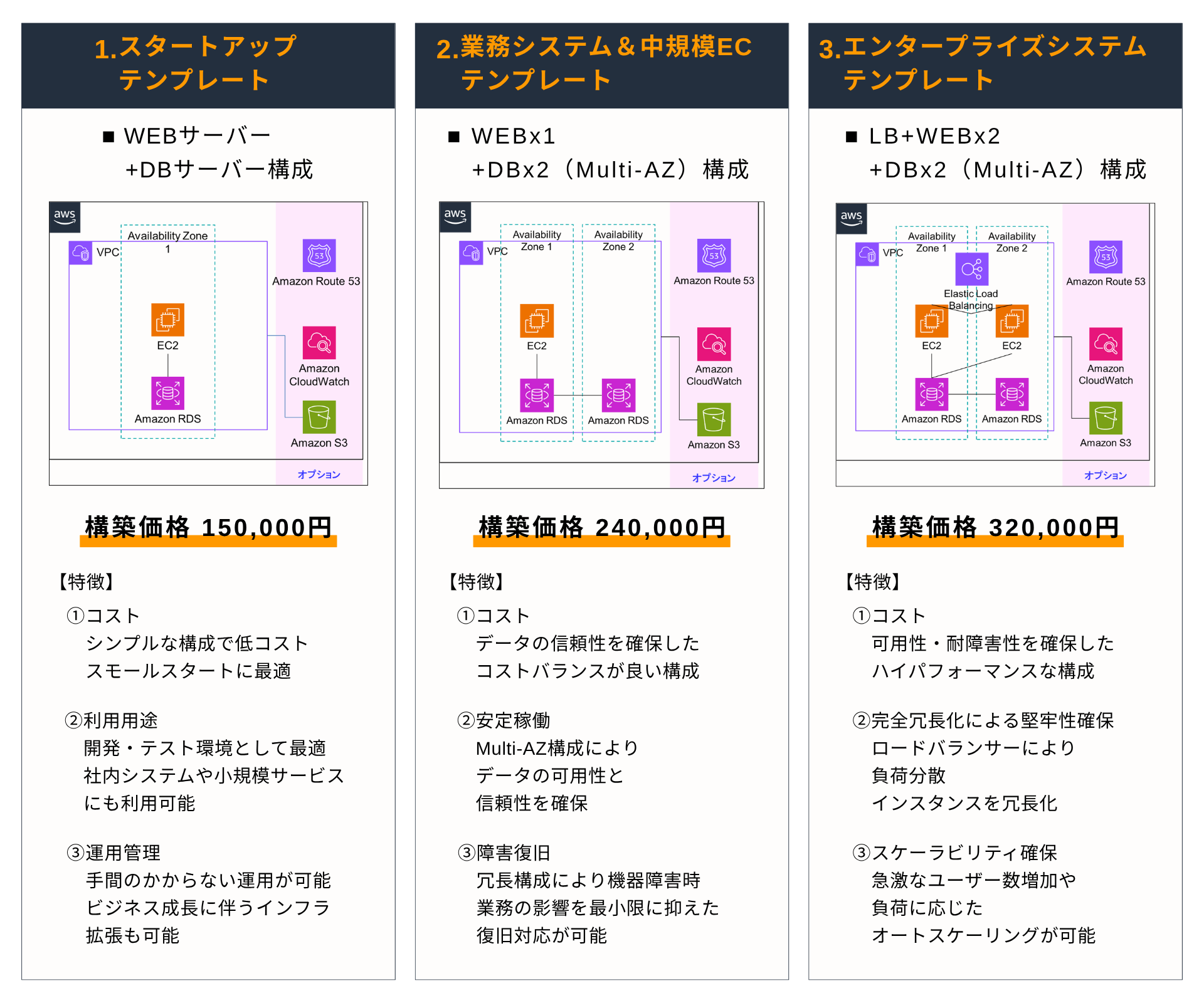 ※記載の構築価格はヒアリングから構築完了までの費用となります オプション費用及びAWS使用料・保守運用費用は別途必要となります