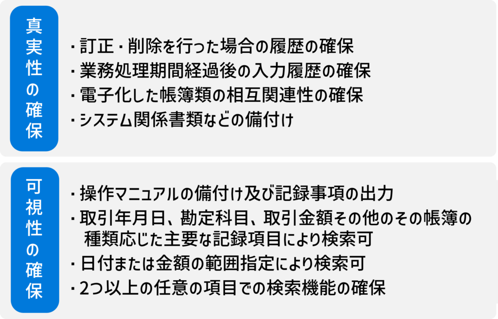 電子帳簿保存法における保存要件は、「真実性の確保」と「可視性の確保」という2つの観点からの要件となります。