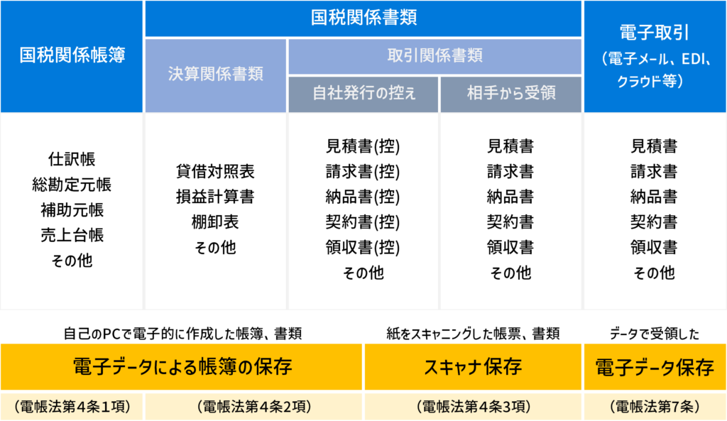 対象文書ごとに電子データの保存、スキャナ保存が適用されます。