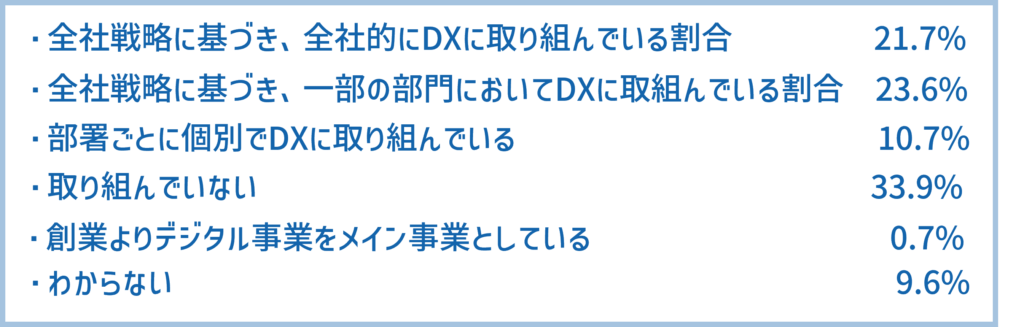 →全体で45%が全社戦略に基づいてDXに取り組んでいることがわかります。