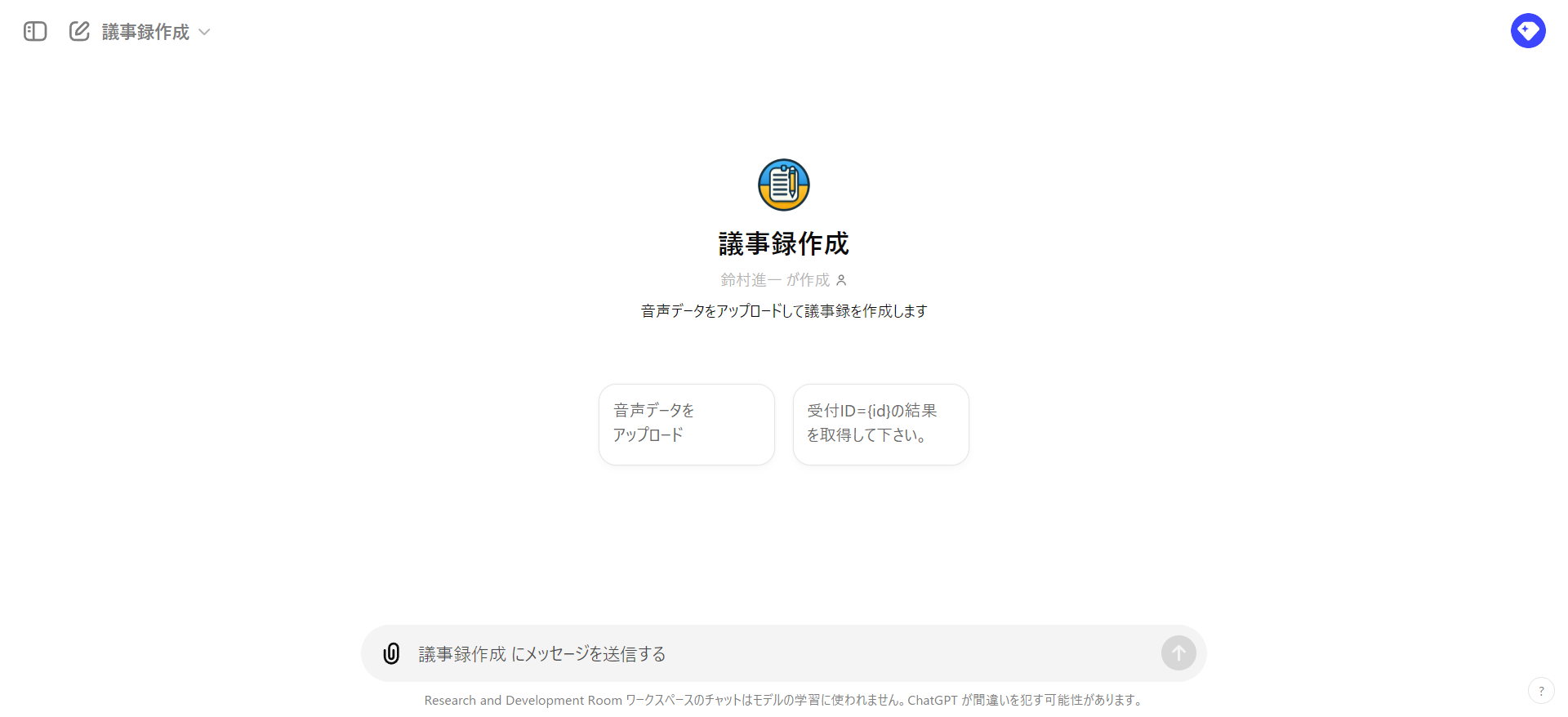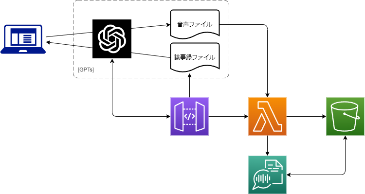音声データをアップロードして議事録を作成するGPTsを構築しました。UIとしてChatGPTを活用し、バックエンドはAWSで構築しました。文字起こしにAmazon Transcribeを使用し、議事録への編集はAmazon Bedrockで生成AIにより行いました。