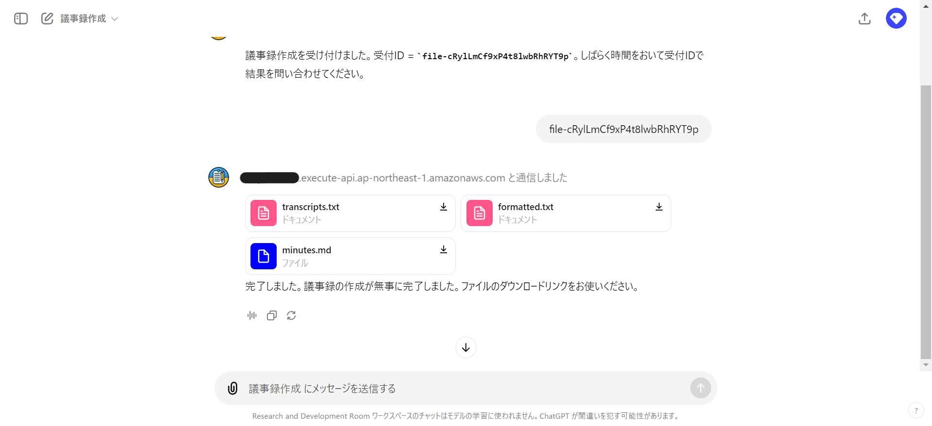 音声データのサイズが大きい場合、OpenAIからファイルを取得してS3に格納する間にGPTsのタイムアウト時間を過ぎてしまう事があるため、情報だけ受け付けます。