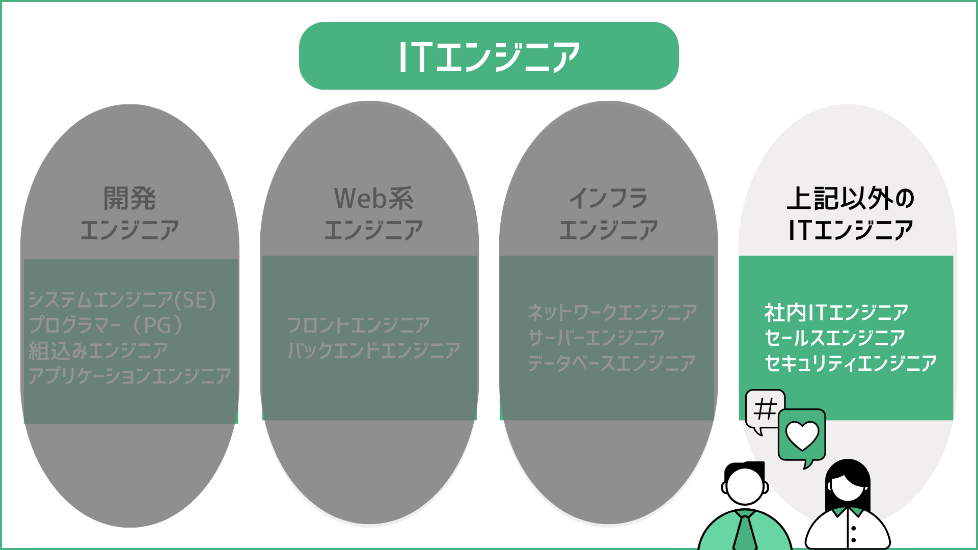 これまでに紹介したITエンジニア以外にも基幹システムの運用、営業をサポートする業務を担う職種などがあります。社内ITエンジニア、セールスエンジニア(SS)、セキュリティエンジニアの3種類をご紹介します。