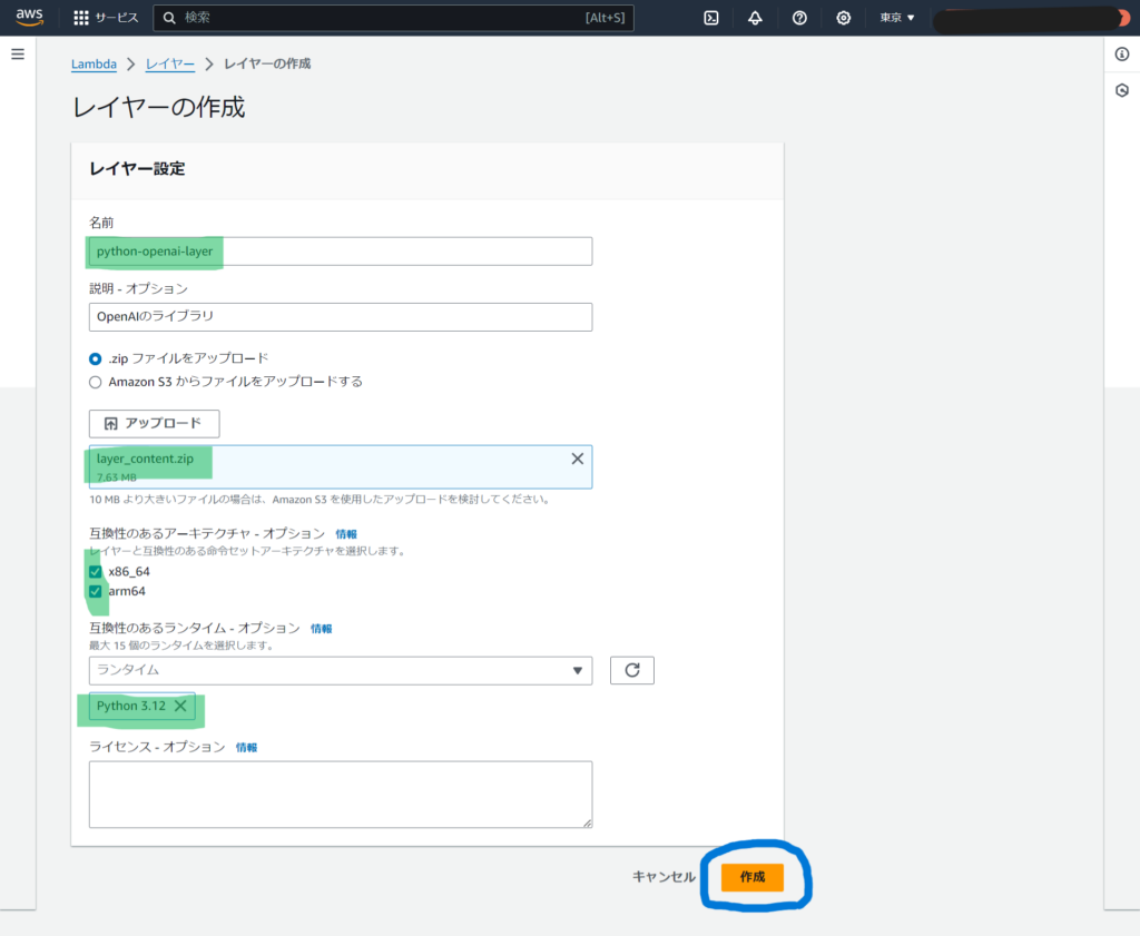 2.作成したZIPファイルを選択し必要情報を入力します。ランタイムは作成したZIPファイルのディレクトリ構成と合わせてください。