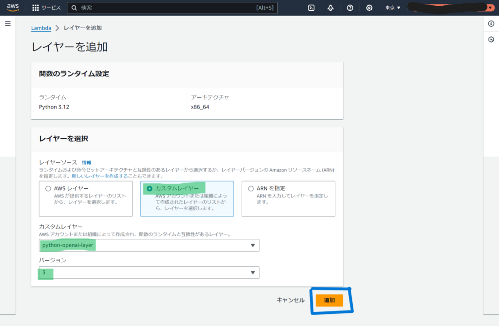 [バージョン]の部分にはLambda関数のランタイムの値を入力します。このディレクトリが無いと以下のエラーが発生します。