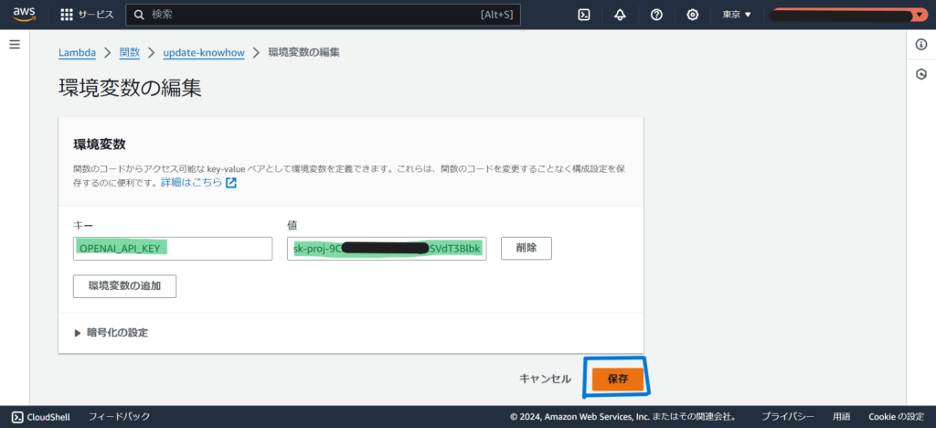 2.キーにOPENAI_API_KEYを入力し、値にOpenAIから取得したAPIキーを入力します。保存をクリックします。