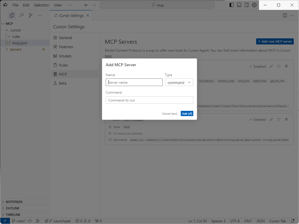 表示されたAdd MCP Serverダイアログに情報を入力し、Addボタンをクリックします。