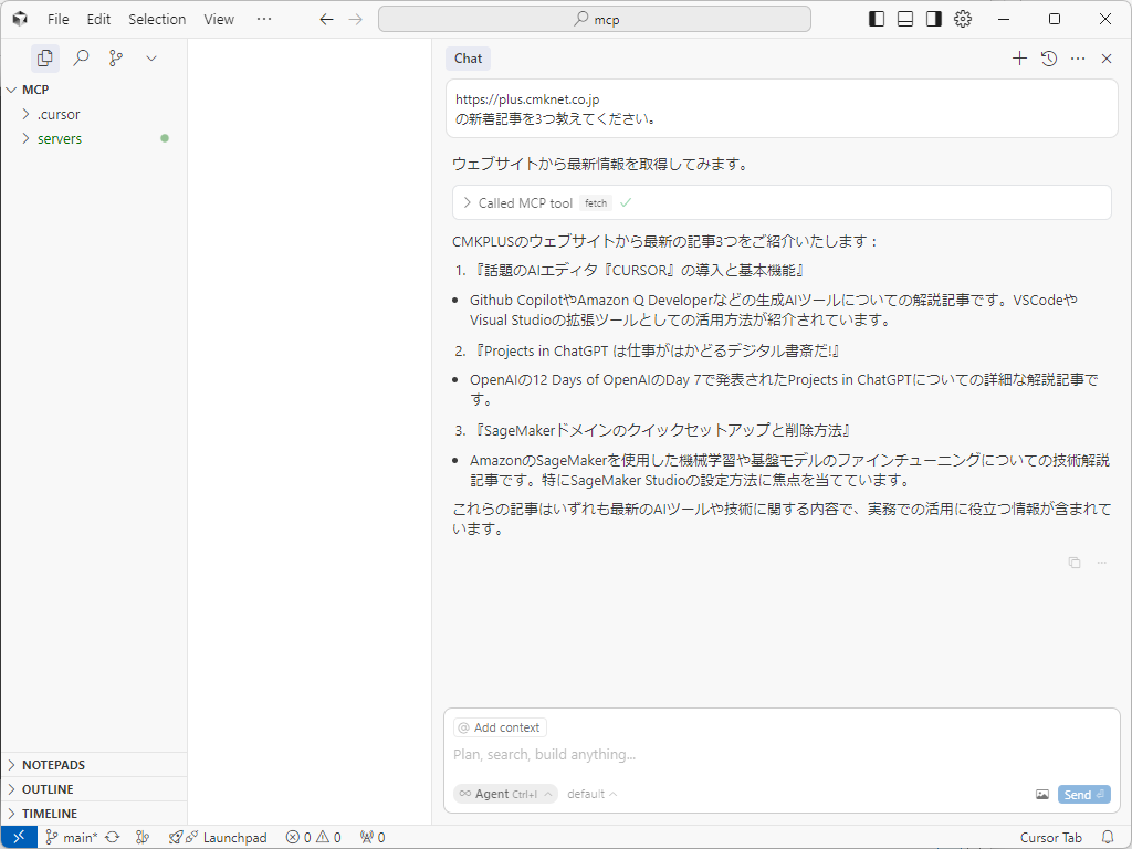 『Cursor』のAgentに「https://cmkplus.aura-office.comの新着記事を3つ教えてください。」と聞いてみました。