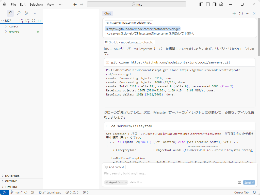動かすにはGitとnode.jsが必要です。AIエディタ『Cursor』のyoloモードに構築させてみました。Ctrl + I からエージェントに以下のプロンプトを与えてみると……。