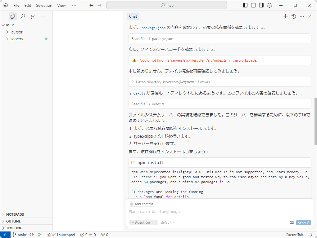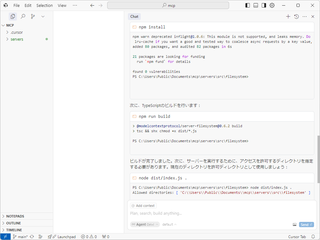 構築したMCPサーバーを動かすには以下のコマンドを実行します。最後のパラメーターはFilesystemのMCPサーバーがコンテキストを取得するパスです。今回は . を指定しているので実行時のパスに存在するファイルを読み取ります。