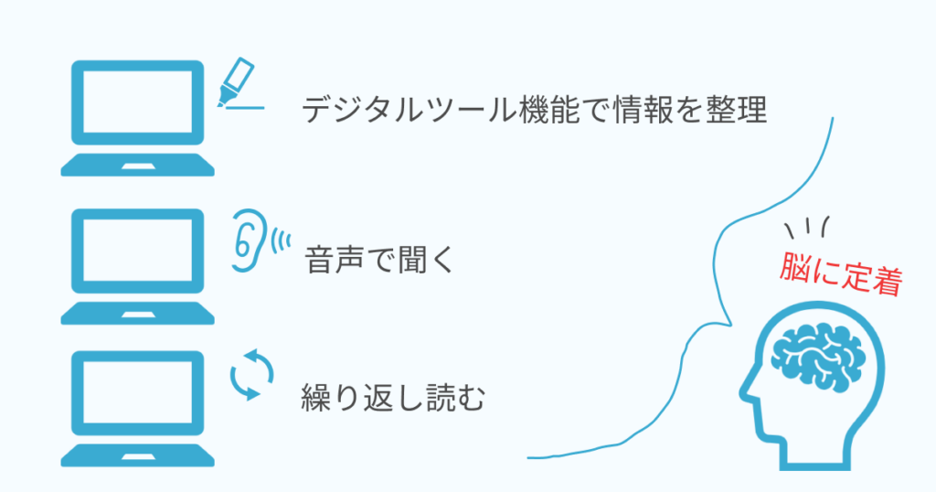 デジタル資料は、場所や時間を選ばずにいつでもどこでも手軽に読めることがメリットなので、このメリットを有効活用し、ふとした時に繰り返し読むことで、記憶に定着しやすくなります。