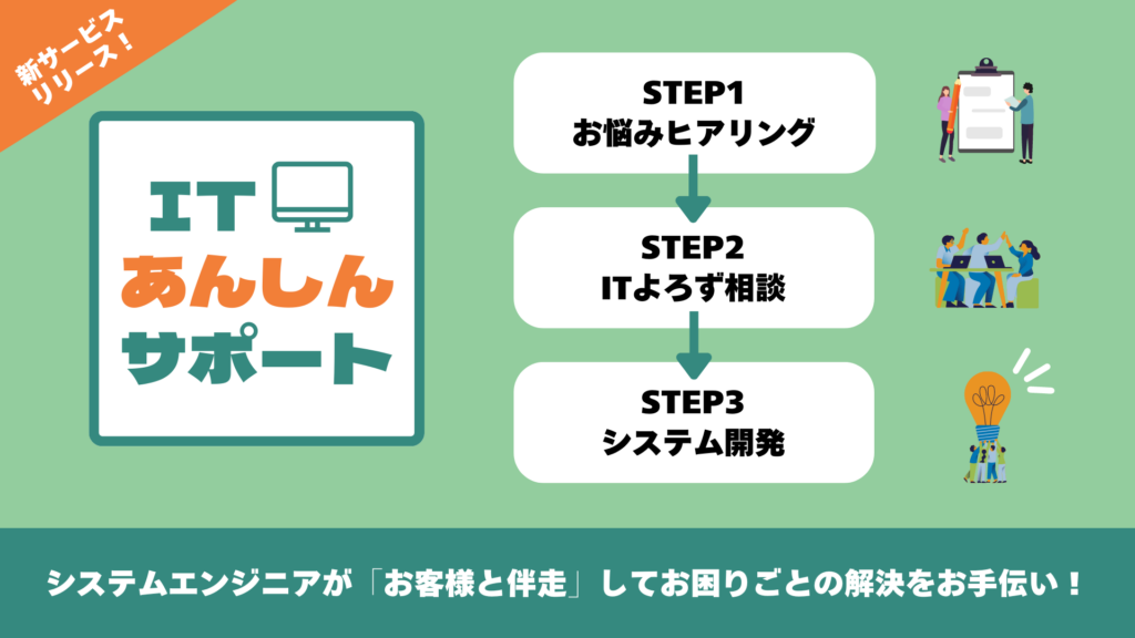 このようなお悩みをお持ちの企業様に、SE伴走型の課題解決支援サービス「ITあんしんサポート」をご提案します。