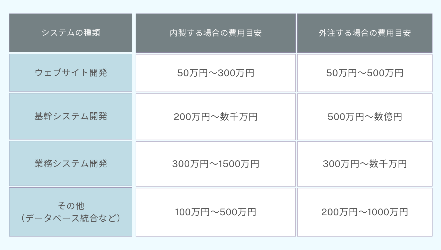 以下は、一般的なシステムの種類別の費用目安です。