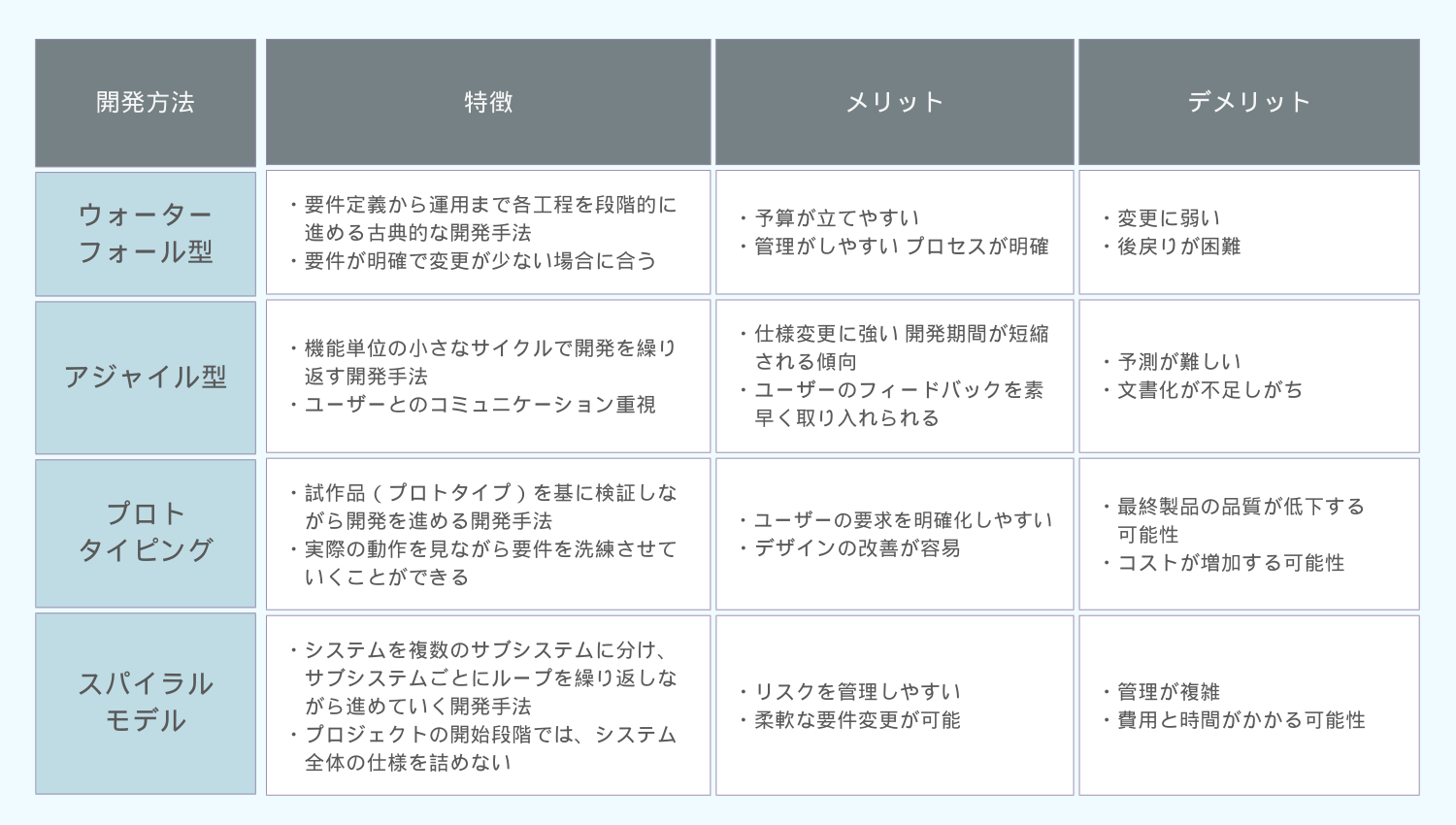 他にも、DevOps(デブオプス)、リーン開発、フィーチャー駆動開発などがありますが基本的には表にあるような開発手法が一般的です。